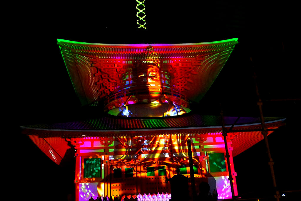 10月以降も金堂のご本尊が再度開帳されるなど、普段では見る事ができない空海ゆかりの文化財や密教の名品に触れることができます。この機会に高野山に足を運ぶことをおススメします!写真は5月に根本大塔(檀上伽藍)で開催された3Dマッピングの様子です。鮮やかに浮き出る如来坐像の姿が幻想的でした。
